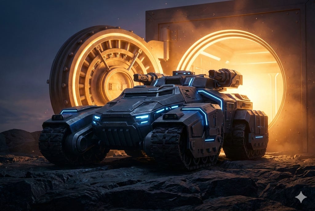You’re test-driving the armored vehicle guarding the central bank vault of a nation called InterLink.