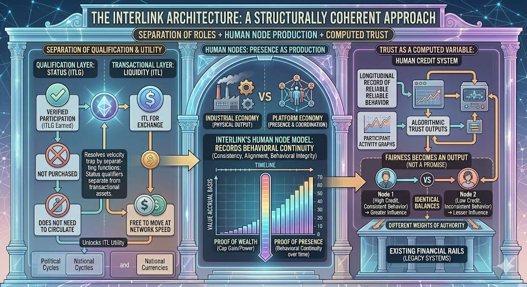 InterLink’s Human Node model records behavioral continuity rather than hardware power or capital leverage — moving the basis of value accrual from proof of wealth to proof of presence.