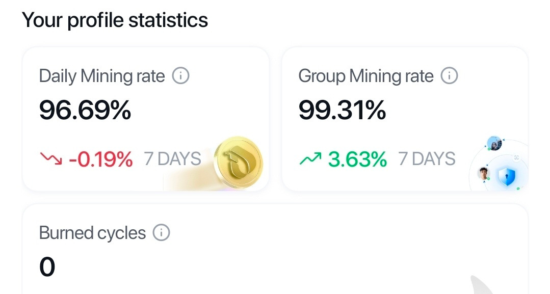 Daily Mining Rate tracks individual participation continuity. Group Mining Rate signals that network integrity carries weight alongside personal output — that readiness is partially relational, not purely individual. Burn Cycle measures the inverse: inconsistency, inactivity, gaps in engagement.