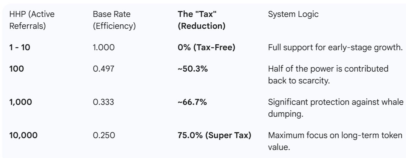 The first 25 to 30 active referrals are your most efficient investment. Each one contributes HHP at full rate, inside the tax-free bracket, backed by the 24-hour rule that keeps the network honest. Beyond that threshold, additional nodes still generate value — but at diminishing marginal returns, by design.