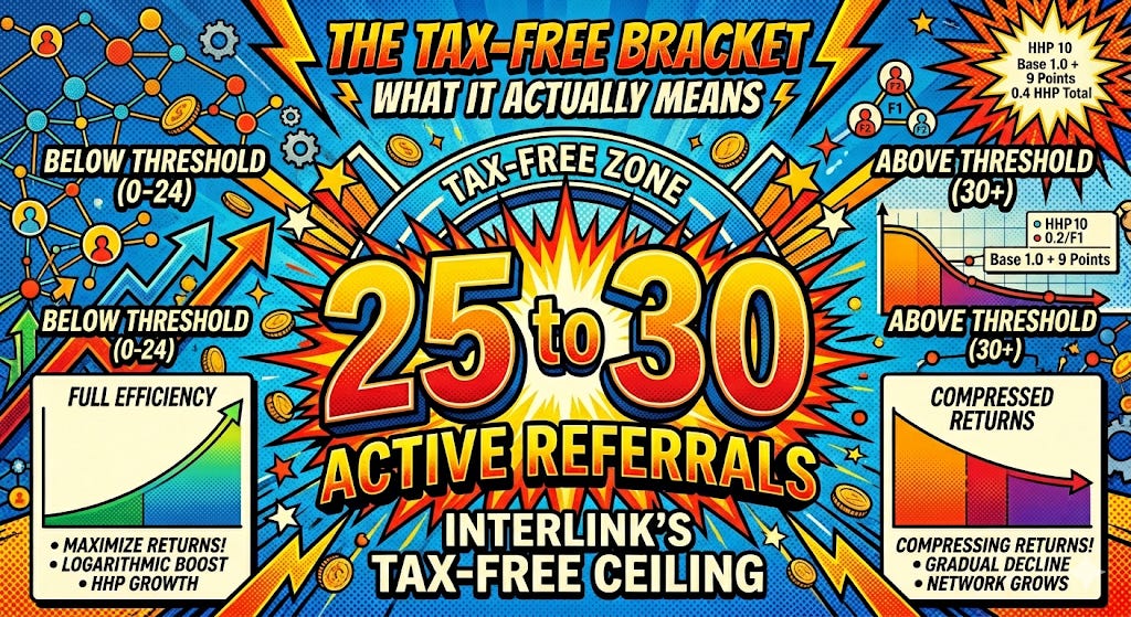 This is the number the whitepaper does not give you directly, but the math delivers cleanly: 25 to 30 active referrals is InterLink’s tax-free ceiling.