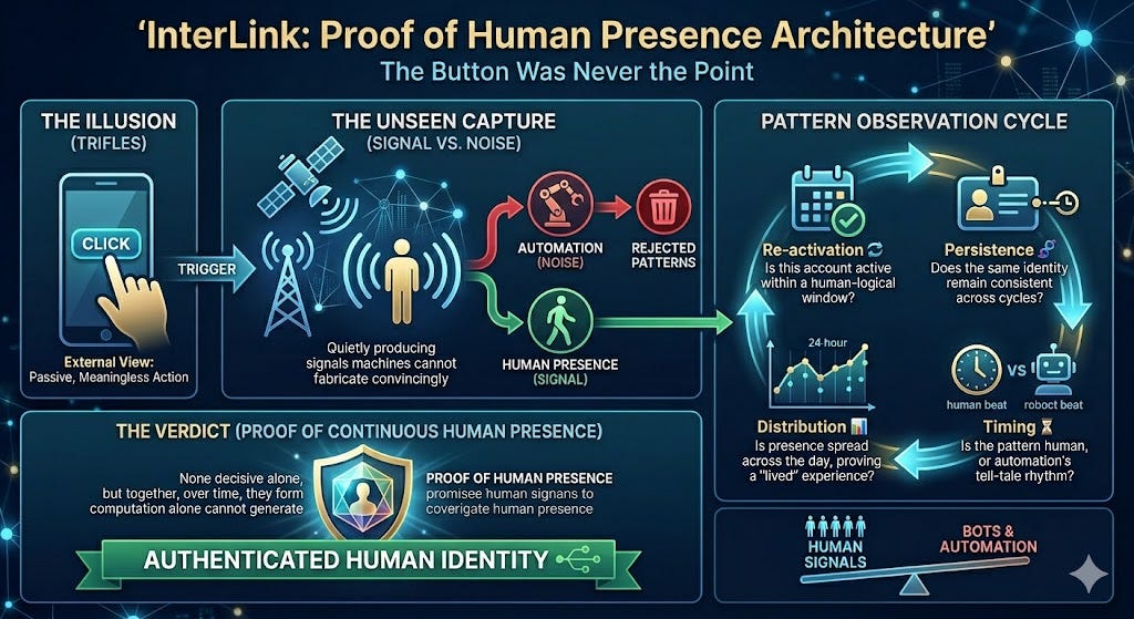 None of these signals are decisive on their own. But together, over time, they form something computation alone cannot generate: Proof of continuous human presence.