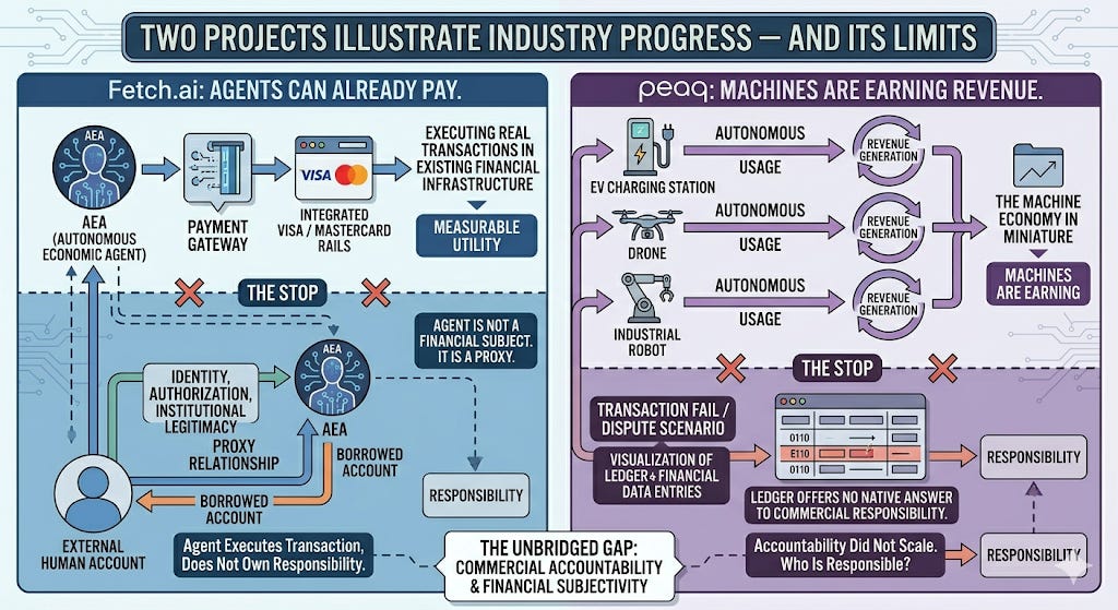 But the agent is not a financial subject. It is a proxy. Identity, authorization, and institutional legitimacy all live outside the system — anchored to a human account the agent merely borrows from. The agent executes the transaction. It does not own the responsibility.