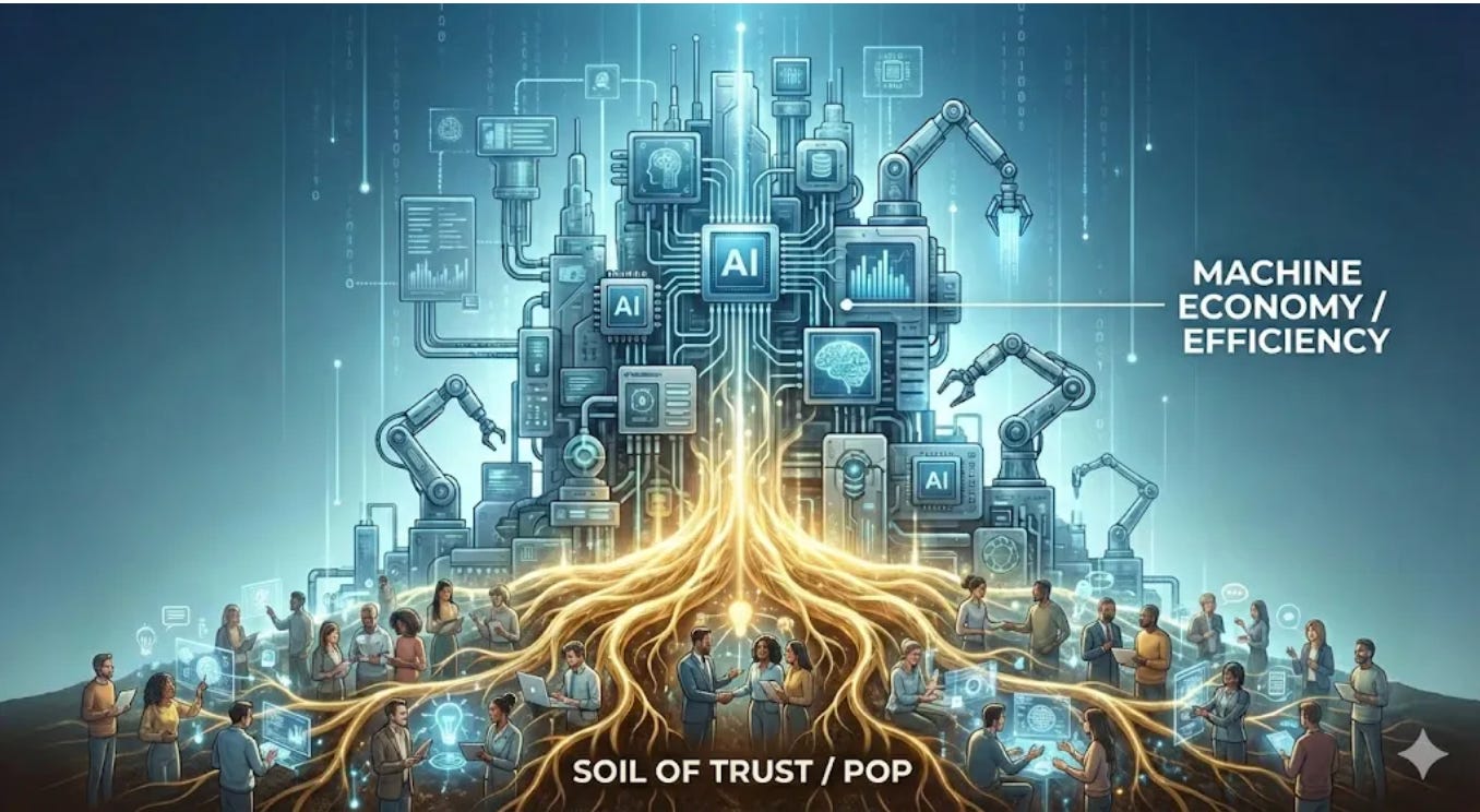And the system is engineered so that the surplus produced by machine activity flows — structurally and mathematically — back to those who provide the one thing the machine economy cannot manufacture on its own: the verified human anchor at its foundation.